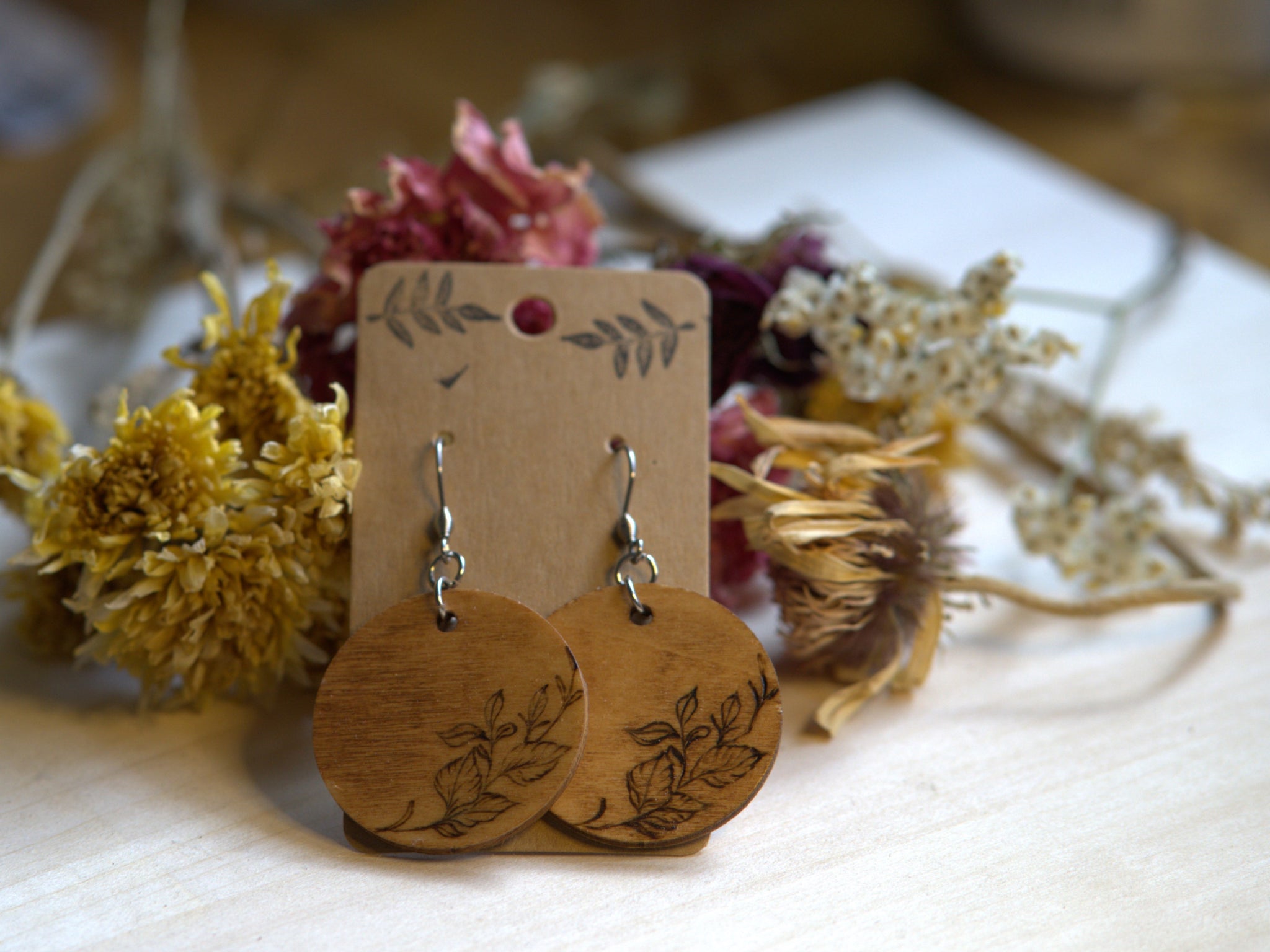 Elevate your accessory game with these stunning handcrafted woodburned earrings, featuring a delicate leafy branch design. Each circular wooden pendant is adorned with a meticulously hand-burned botanical motif, showcasing the natural beauty of wood and craftsmanship.