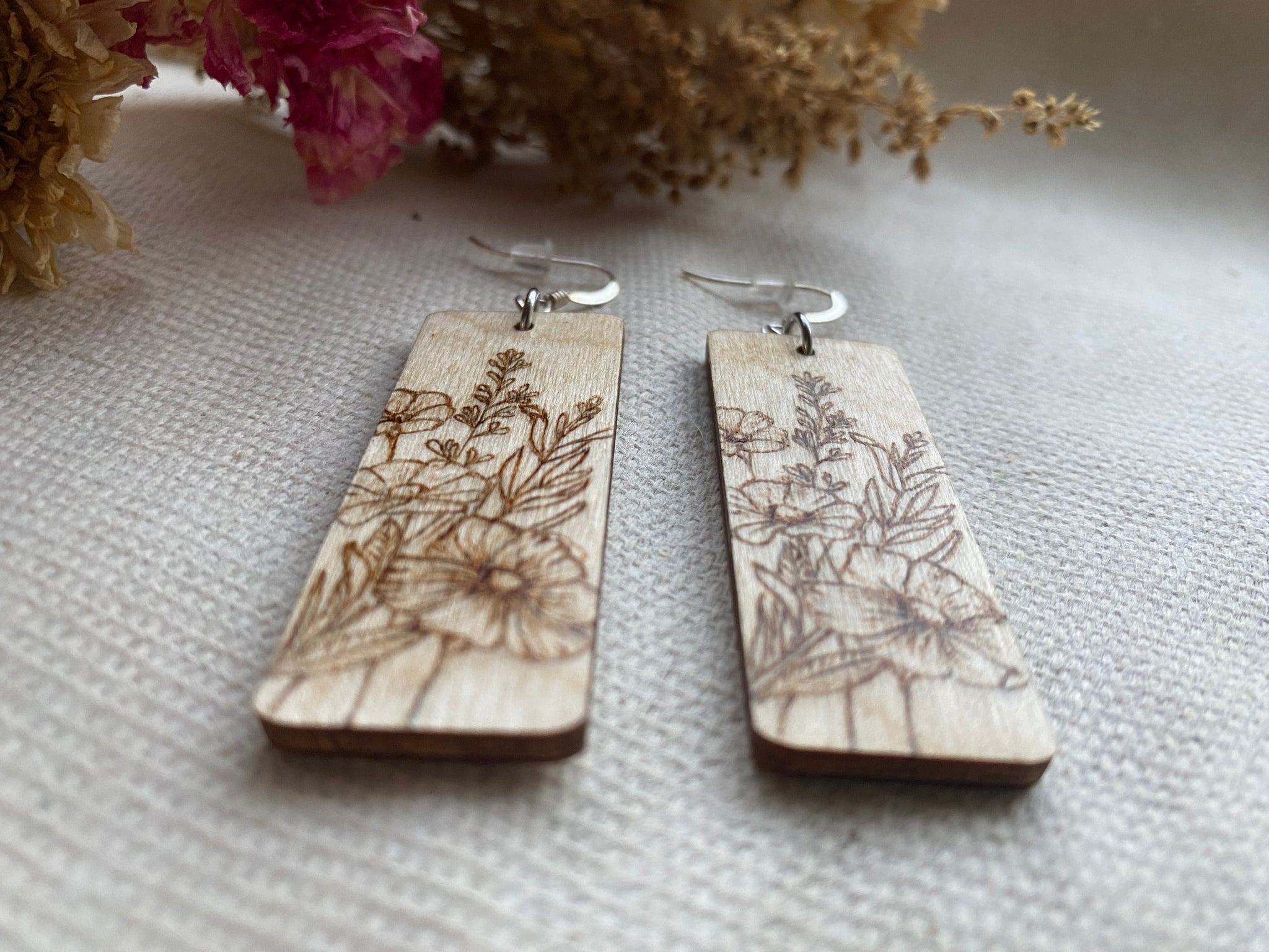 Handcrafted Woodburned Floral Earrings – Rectangle Nature Design